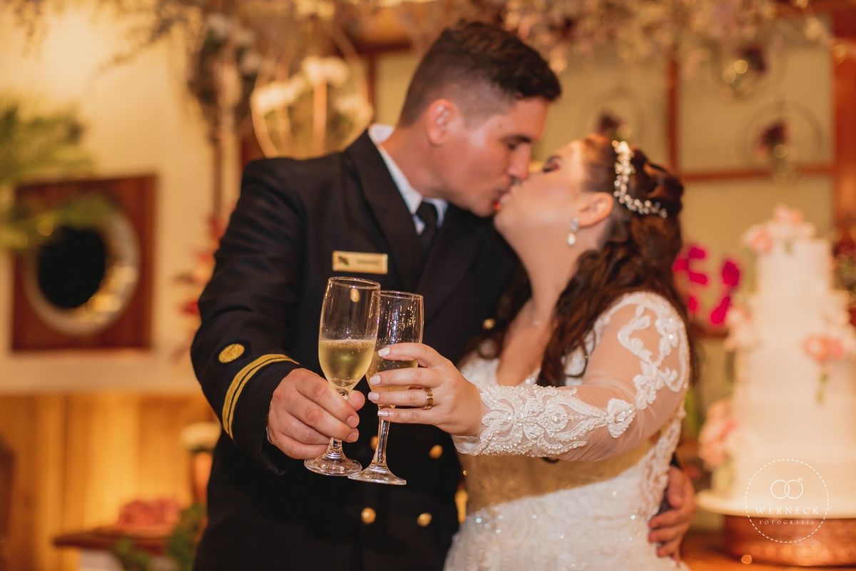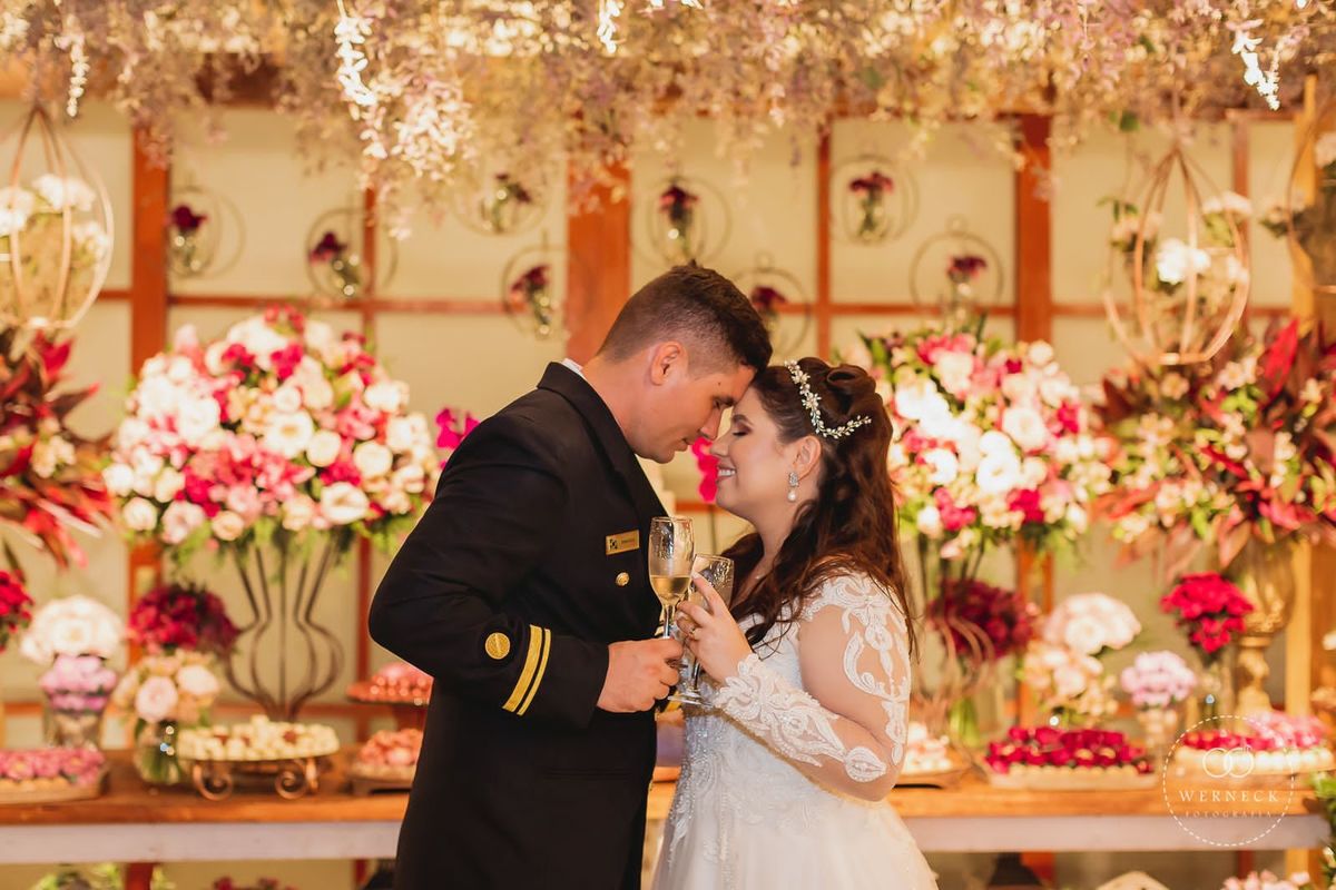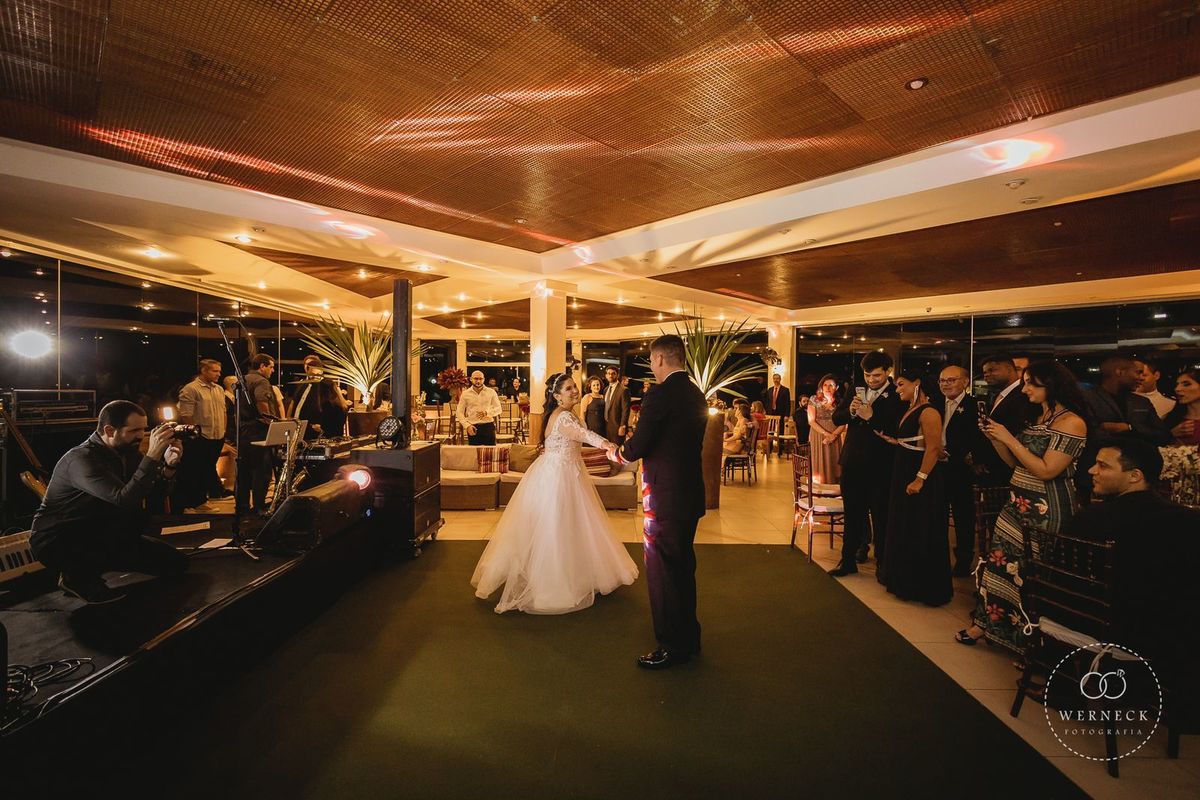 O mobiliário utilizado foi branco, madeira clássica e transparente, para dar leveza ao salão. Foram utilizadas muitas velas na decoração: colunas de parafinas, peças e castiçais com velas, e velas nos arranjos e mesas de convidados. Tivemos uma bela pista de danças em Led, para deixar a noite ainda mais animada. Show com Banda e até cabine de fotos divertidas.