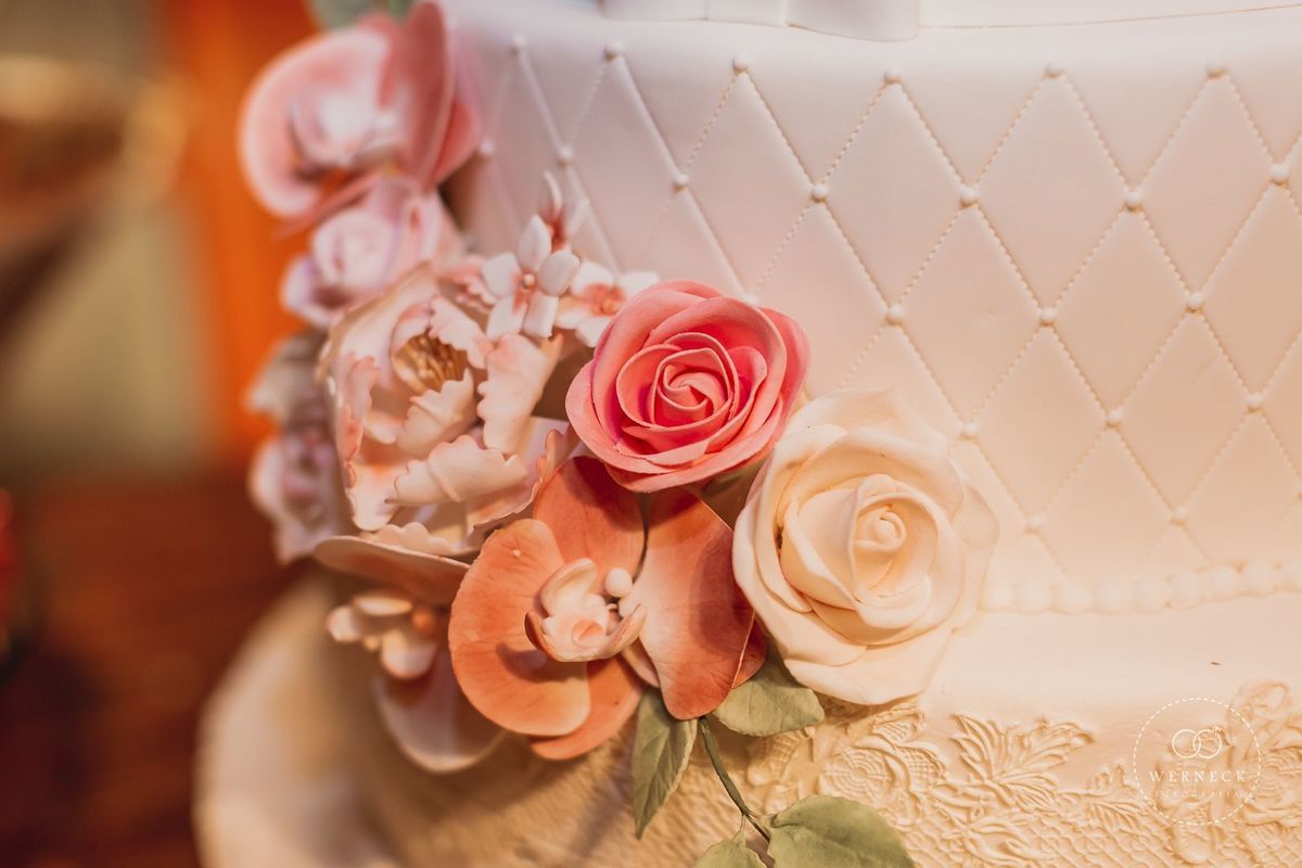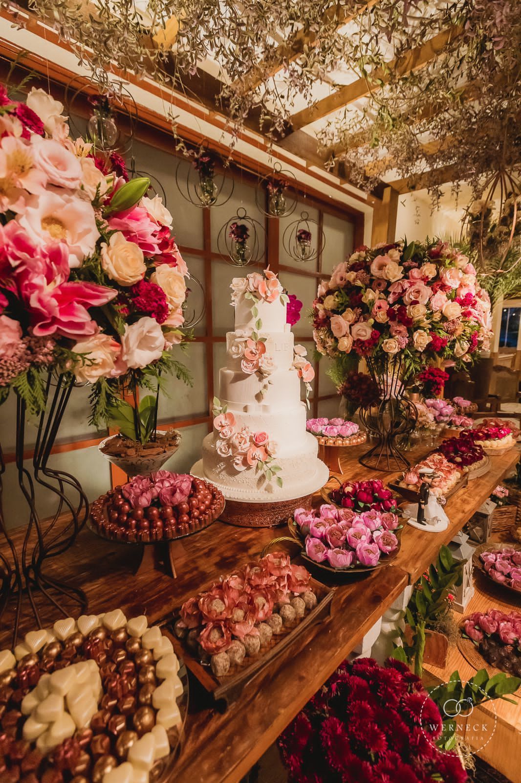 Destaque para as lindas áreas do bolo e dos doces, com espelhos venezianos, candelabros de cristal cristal e arranjos magníficos e cordões de flores por toda a mesa.